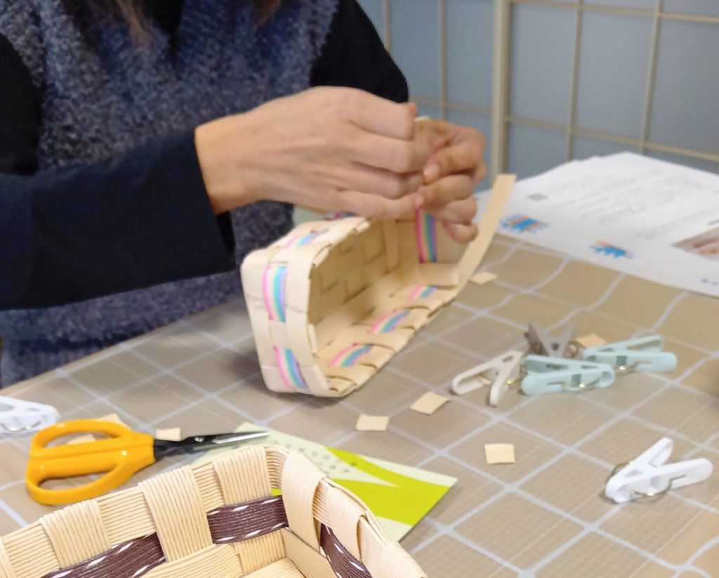 クラフトバンドとは何か?のお話から始まり、底作りを行いました。底の構造を理解しながら手を動かします。右、左、上、下、などと言いながら、順番に手を動かすことで脳のトレーニングにもなりますね!